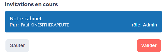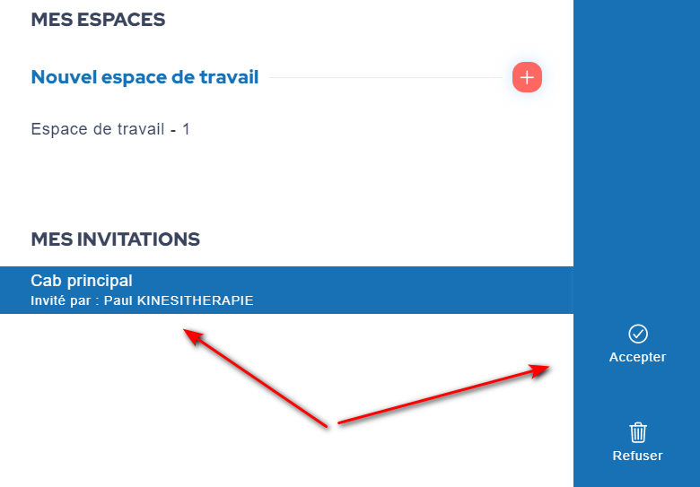 - En dessous de la liste des espaces de travail, une nouvelle section « Mes invitations » est apparue. Vous y trouverez des informations sur l’espace de travail auquel vous êtes invité à collaborer, ainsi que le nom du Kinésithérapeute qui vous a envoyé l’invitation.