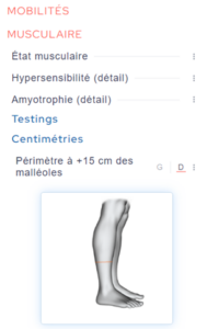 Ici on combine une rubrique fermée (Mobilités), une rubrique ouverte (Musculaire). Un groupe fermé (Testings) et un autre ouvert (Centimétries). Des items fermés (État musculaire, hypersensibilté et amyotrophie) et un item ouvert (Périmètre à +15 cm…).